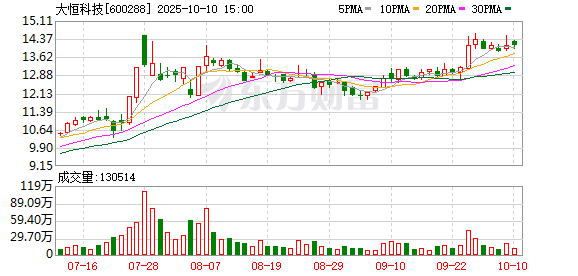 交易行情显示,10月10日,大恒科技收涨0.07%,收于14.12元/股,总市值61.68亿元。